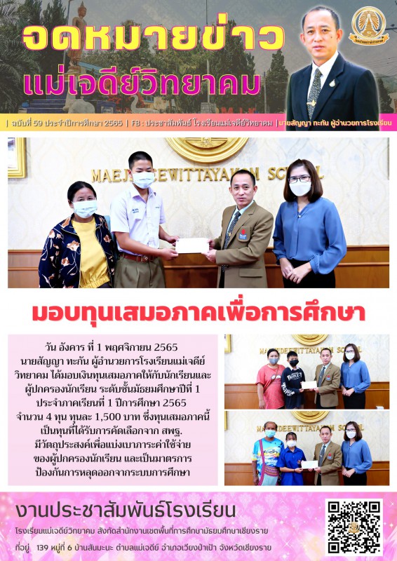นายสัญญา ทะกัน ผู้อำนวยการโรงเรียนแม่เจดีย์วิทยาคม ได้มอบเงินทุนเสมอภาคให้กับนักเรียนและผู้ปกครองนักเรียน ระดับชั้นมัธยมศึกษาปีที่ 1 ประจำภาคเรียนที่ 1 ปีการศึกษา 2565 จำนวน 4 ทุน ทุนละ 1,500 บาท ซึ่งทุนเสมอภาคนี้ เป็นทุนที่ได้รับการคัดเลือกจาก สพฐ. มีวัตถุประสงค์เพื่อแบ่งเบาภาระค่าใช้จ่ายของผู้ปกครองนักเรียน และเป็นมาตรการป้องกันการหลุดออกจากระบบการศึกษา
